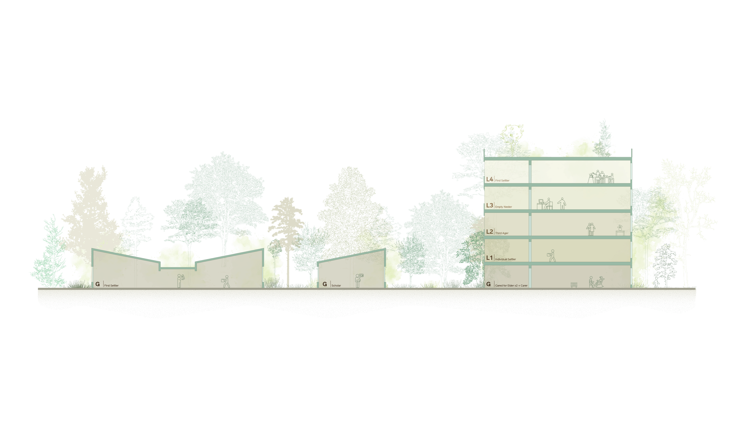 At its heart, Zoe Natura reimagines the idea of home - where ten life stage pods may share resources as one living ecosystem. Regenerative food forests, shared electric vehicles, multigenerational dwellings, and restorative landscapes make up a dynamic, self-sustaining village.